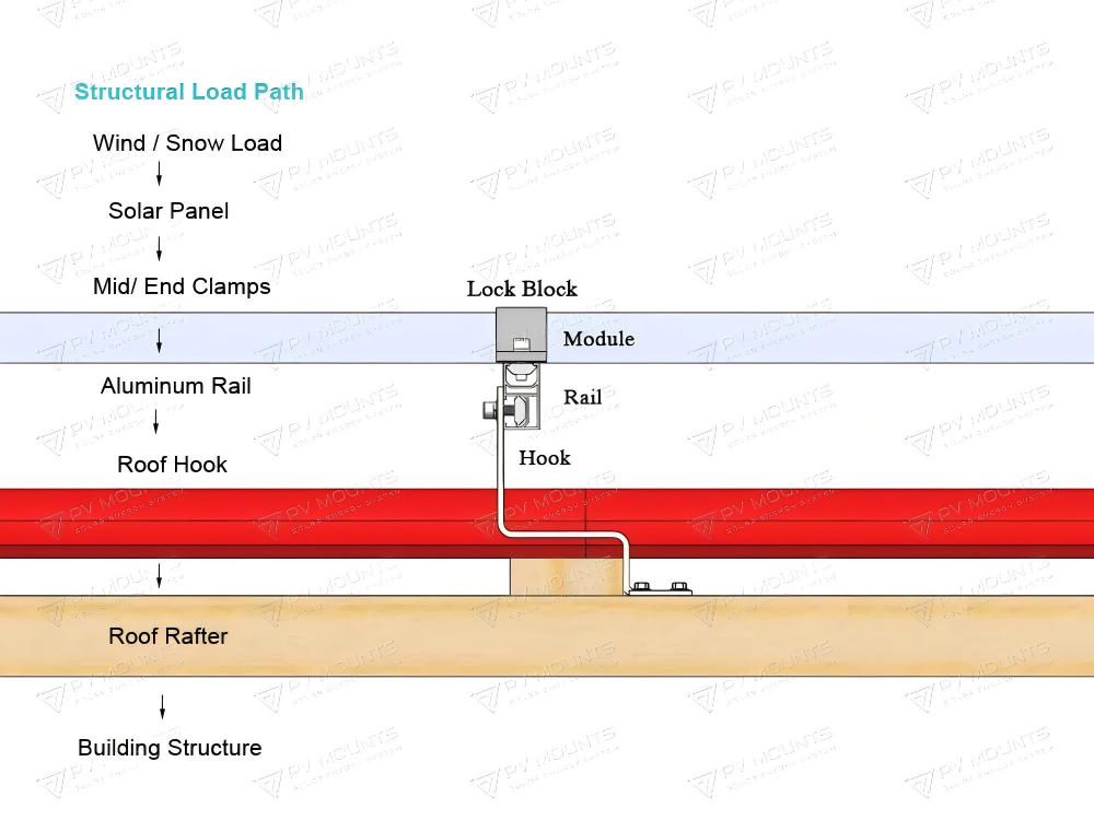 In tile roof solar installations, loads follow this path: